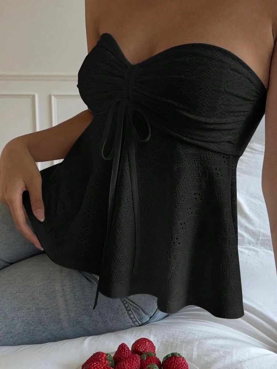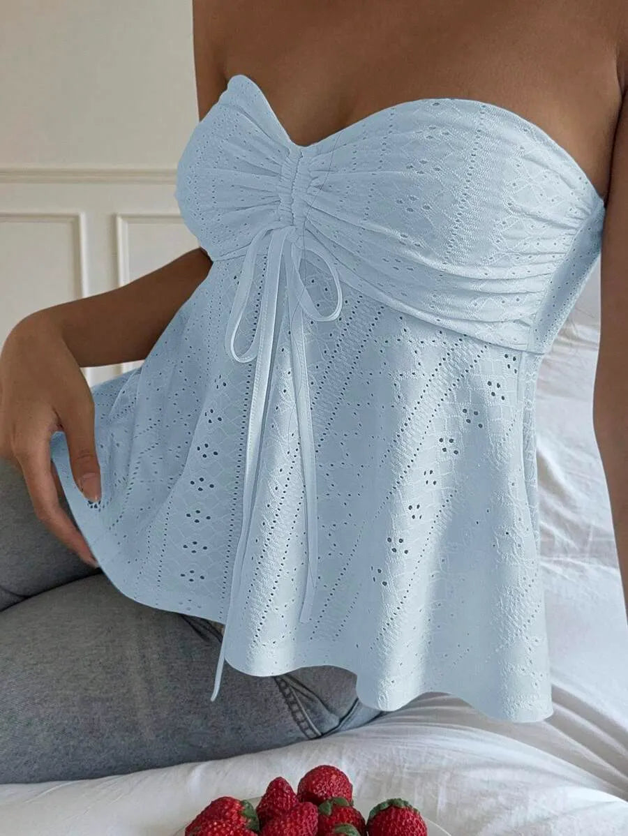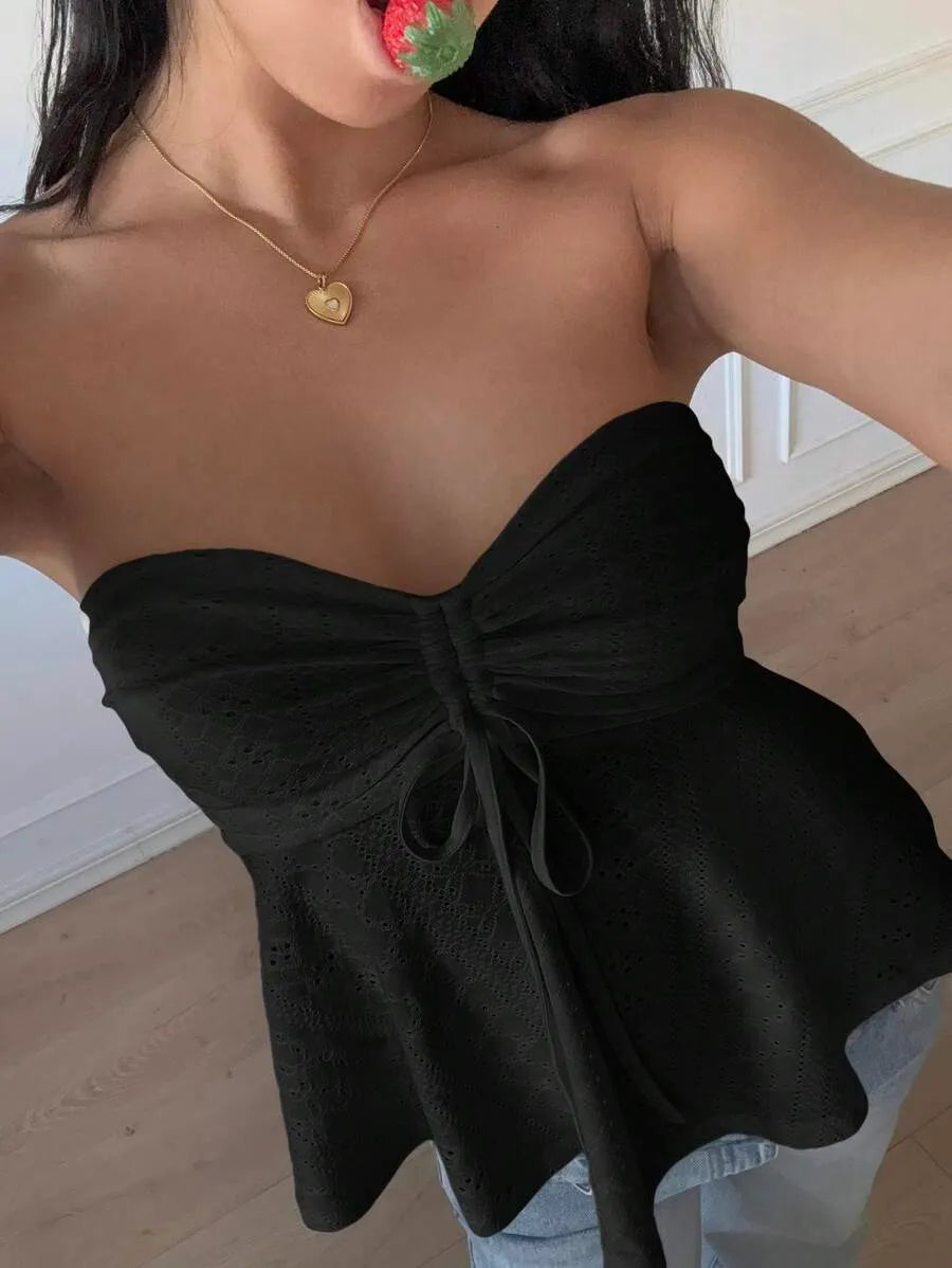 This strapless knit bandeau tube top combines casual style with comfort in a slim-fit, cropped design. Crafted from a medium-stretch blend of polyester and elastane, it offers flexibility and a flattering fit. The flared hem, drawstring detail, and ruching with subtle eyelet embroidery create a refined texture absent of lining for breathability. Ideal for daily wear, beach outings, or layering, this mustard yellow piece pairs effortlessly with a variety of outfits. Easy to care for with machine wash or professional dry cleaning, it’s a versatile addition to your summer wardrobe.