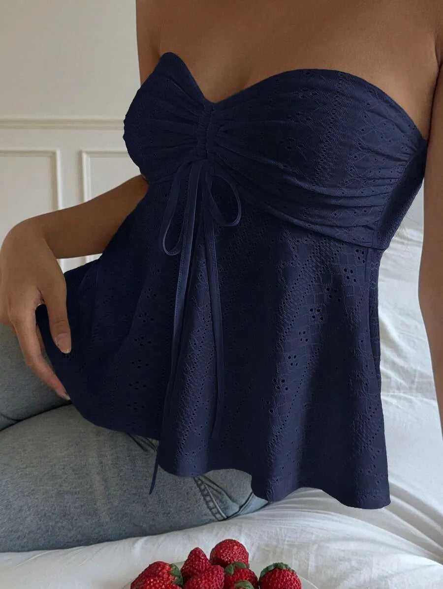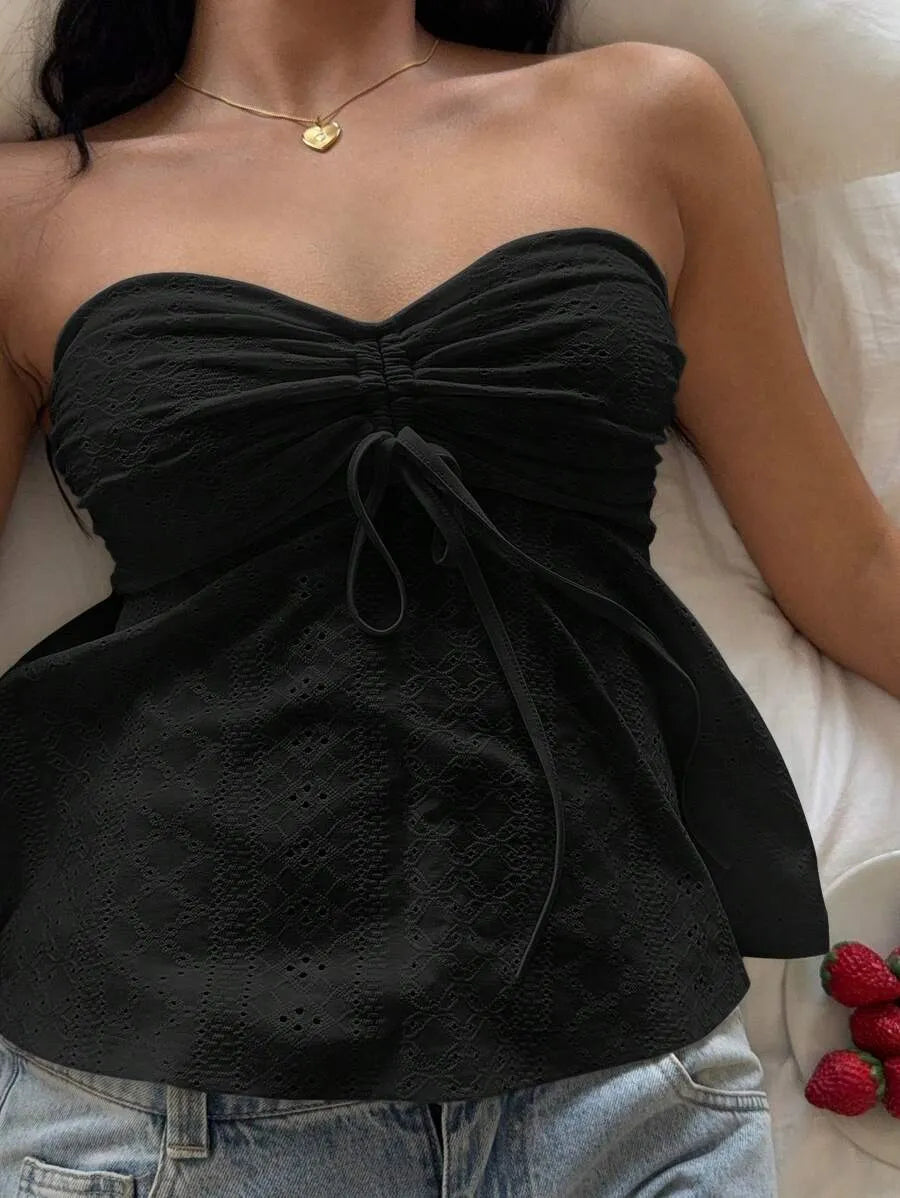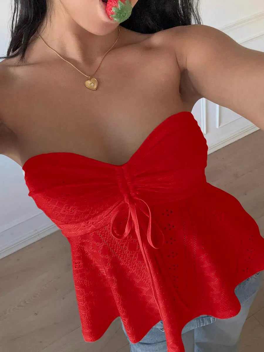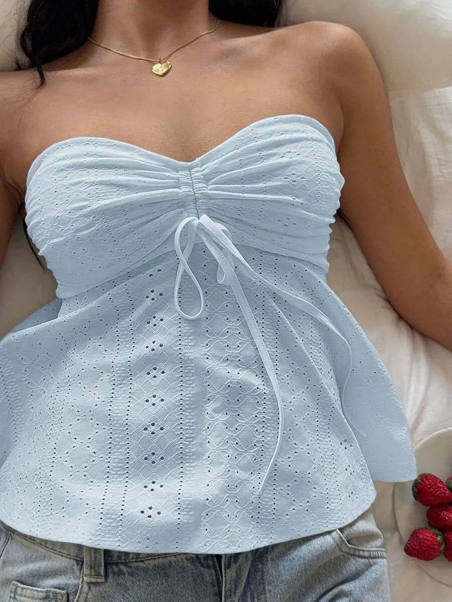 This strapless knit bandeau tube top combines casual style with comfort in a slim-fit, cropped design. Crafted from a medium-stretch blend of polyester and elastane, it offers flexibility and a flattering fit. The flared hem, drawstring detail, and ruching with subtle eyelet embroidery create a refined texture absent of lining for breathability. Ideal for daily wear, beach outings, or layering, this mustard yellow piece pairs effortlessly with a variety of outfits. Easy to care for with machine wash or professional dry cleaning, it’s a versatile addition to your summer wardrobe.