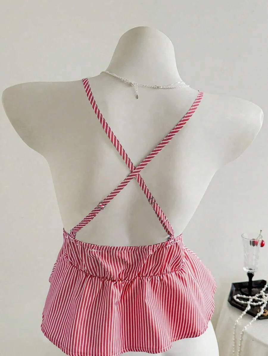 This slim-fit camisole features a red striped pattern with a flattering asymmetrical ruffle hem and a stylish criss-cross back, perfect for casual beachwear or festive occasions like Ramadan and Eid. Made from lightweight, medium-stretch knitted polyester, it ensures comfort and breathability without lining. Its spaghetti straps and backless design offer a breezy feel for warm weather, while easy machine wash or dry clean care makes it a practical addition to your summer wardrobe.